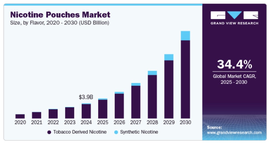 글로벌 니코틴 파우치 시장 규모는 2024년 39억 5천만 달러로 추정되며, 2025년부터 2030년까지 연평균 34.4%의 성장률을 보일 것으로 예상됩니다. 금연을 시도하는 젊은 소비자들 사이에서 니코틴 패치에 대한 관심이 증가하고, 폐에 노출되지 않는 대체 제품에 대한 수요가 증가함에 따라 예측 기간 동안 산업이 성장할 것입니다. 미국 최고의 공립 연구 대학 중 하나인 러트거스 대학은 2022년 3월에 미국 흡연자들의 니코틴 패치에 대한 소비자 인식과 관심을 평가하는 보고서를 발표했습니다. 미국 내 흡연자 1,018명을 대상으로 니코틴 패치에 대한 지식에 대한 설문 조사를 실시한 결과, 흡연자의 약 29%가 이러한 제품을 알고 있었고, 6%가 제품을 사용해 본 적이 있으며, 17%가 사용에 관심이 있는 것으로 나타났습니다.