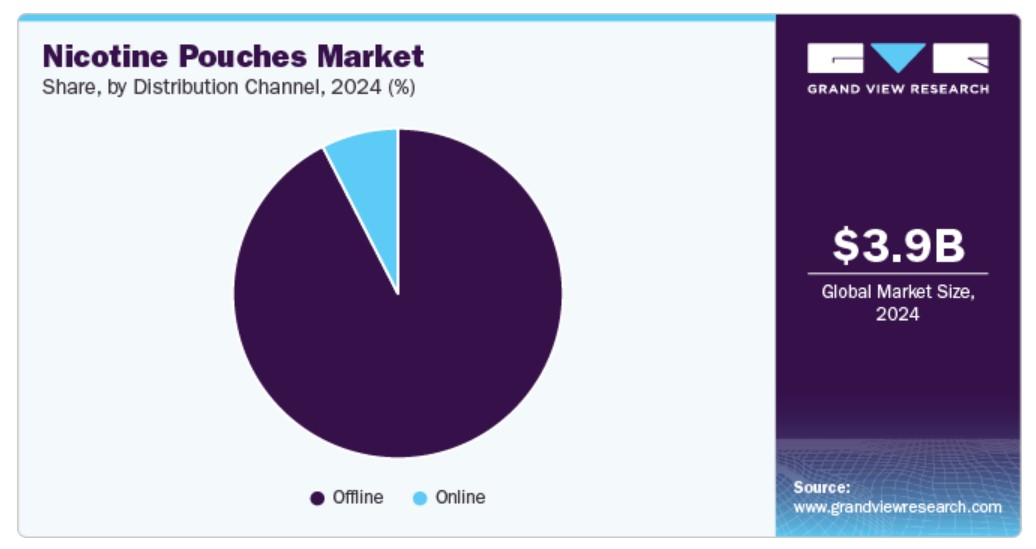합성 니코틴 파우치 부문은 2025년부터 2030년까지 연평균 성장률 53.6%로 성장할 것으로 예상됩니다. 일부 소비자들은 합성 니코틴 파우치를 담배 잎이나 연소 부산물이 포함되지 않은 잠재적으로 더 안전한 대안으로 간주합니다. 이는 건강에 민감한 소비자 행동의 광범위한 추세와 일치하는데, 개인이 덜 해로운 것으로 인식되는 제품을 추구하는 경향입니다. 또한, 합성 니코틴 파우치에 제공되는 다양한 맛은 참신하고 즐거운 경험을 추구하는 소비자, 특히 젊은 층의 소비자에게 어필합니다. 합성 니코틴 파우치든 전통적인 니코틴 파우치든, 니코틴 파우치가 제공하는 편리함과 신중함은 흡연이 금지된 다양한 환경에서 신중하게 사용할 수 있기 때문에 인기에 기여합니다.