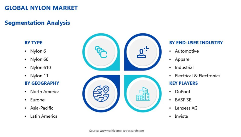 글로벌 나일론 시장은 유형, 제품, 최종 사용자 산업, 응용 분야 및 지리학에 따라 세분화됩니다.