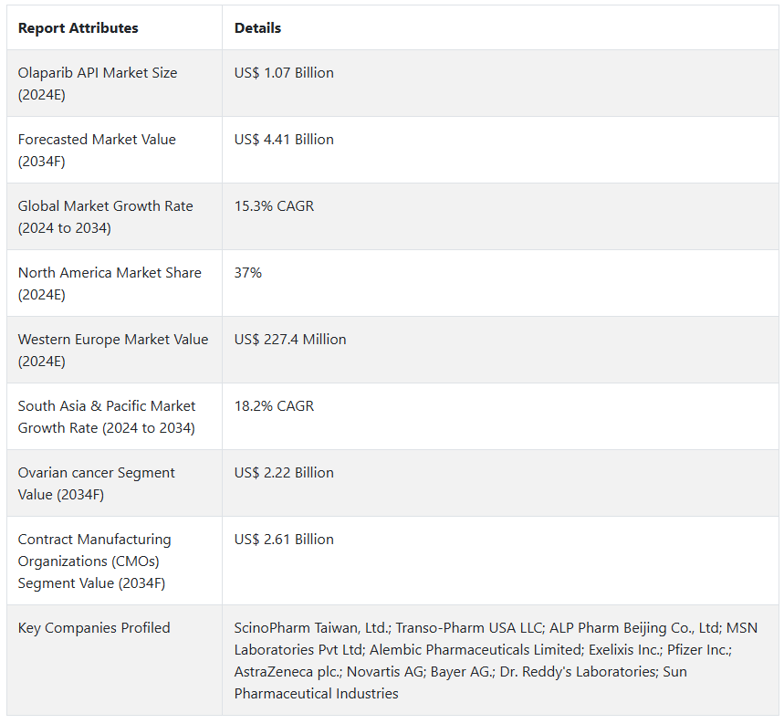 Fact.MR이 발표한 새로운 업계 보고서에 따르면, 글로벌 올라파립 API 시장의 매출은 2024년에 미화 10억 7천만 달러로 추정되며, 2034년까지 연평균 15.3%의 우수한 성장률로 증가하여 2034년 말까지 미화 44억 1천만 달러의 가치를 달성할 것으로 평가됩니다.