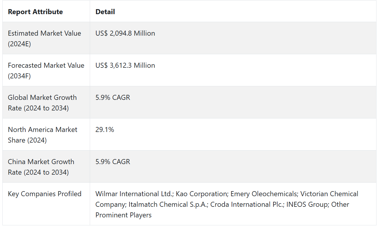 시장에서 두각을 나타내고 있는 업체로는 윌마 인터내셔널(Wilmar International Ltd.), 가오(Kao Corporation), 에머리 올레케미컬(Emery Oleochemicals), 빅토리아 케미컬 컴퍼니(Victorian Chemical Company), 이탈매치 케미컬(Italmatch Chemical S.p.A.), 크로다 인터내셔널(Croda International Plc.), 이네오스 그룹(INEOS Group) 등이 있습니다.