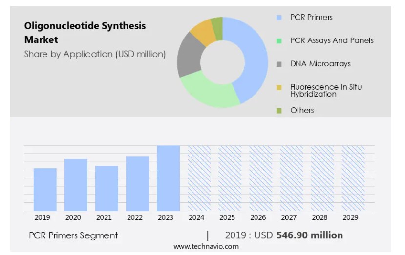 글로벌 올리고뉴클레오티드 합성 시장 : 적용 분야 (PCR 프라이머, PCR 분석 및 패널, DNA 마이크로어레이, 형광 인시튜 하이브리드화, 기타), 한국, 아시아, 미국, 2025-2029, 시장 규모