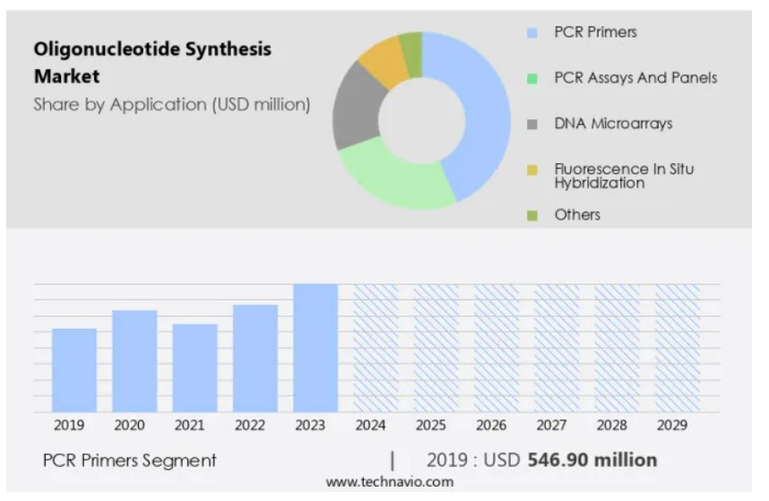 올리고뉴클레오티드 합성 시장에서 가장 큰 시장 점유율을 차지하고 있는 분야는 무엇입니까?