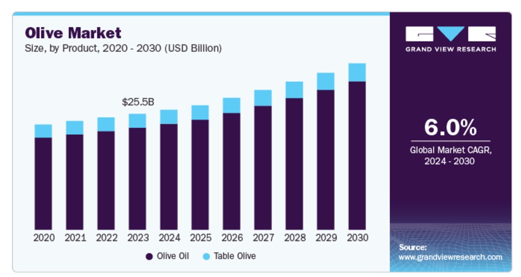 전 세계 올리브 시장 규모는 2023년 255억 달러로 추정되며, 2024년부터 2030년까지 6.0%의 연평균 성장률로 성장할 것으로 예상됩니다. 올리브 시장 성장의 주요 원동력은 올리브와 올리브 오일의 건강상 이점에 대한 소비자 인식이 높아지고 있다는 점입니다. 올리브는 항산화제와 건강한 지방이 풍부하여 심장 건강과 전반적인 웰빙을 지원합니다. 건강한 식단 선택에 대한 이러한 변화는 특히 전통적으로 지중해식 식단과 관련이 없는 비유럽 국가에서 올리브 오일에 대한 수요를 급증시켰습니다. 소비자들의 영양에 대한 지식이 높아지면서 올리브 오일, 특히 엑스트라 버진 올리브 오일(EVOO)의 건강상 이점에 대한 인식이 높아지고 있습니다. 연구에 따르면 EVOO에는 단일 불포화 지방과 항산화 물질이 풍부하여 나쁜 콜레스테롤(LDL)은 낮추고 좋은 콜레스테롤(HDL) 수치는 높일 수 있는 것으로 나타났습니다. 이로 인해 올리브 오일을 건강한 지방 대체 식품으로 매일 식단에 포함시키는 것에 대한 관심이 높아졌습니다.