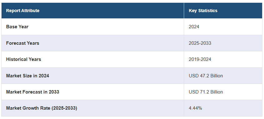전 세계 안과 의약품 시장 규모는 2024년에 472억 달러에 달했습니다. 앞으로 IMARC 그룹은 2025~2033년 동안 4.44%의 성장률(CAGR)을 보이며 2033년까지 시장이 712억 달러에 이를 것으로 예상하고 있습니다. 이 시장은 안과 질환 진단을 받은 개인의 증가, 약물 전달 시스템의 상당한 기술 발전, 유리한 정부 이니셔티브 및 자금 지원, 노인 인구 증가, 당뇨병 환자 수 증가에 의해 추진되고 있습니다.
