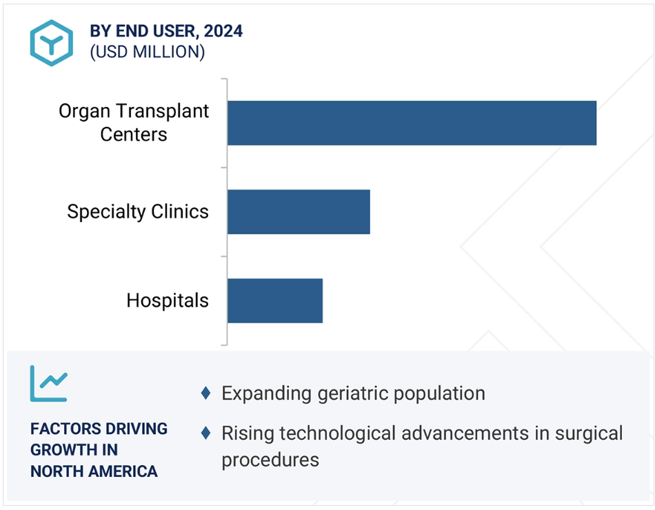 2024년에 북미가 큰 점유율을 차지한 이유는 의료 인프라의 발전, 장기 이식 수술의 증가, 만성 질환으로 인한 장기 부전의 유병률 증가, 장기 기증 및 이식 프로그램에 대한 정부 및 민간 부문의 강력한 지원 등입니다.