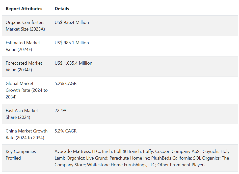 Fact.MR은 최근 발표된 보고서에서 지역별 주요 유기농 이불 제조업체의 가격대, 판매 성장, 생산 능력, 투기적 기술 확장에 대한 자세한 정보를 제공했습니다.