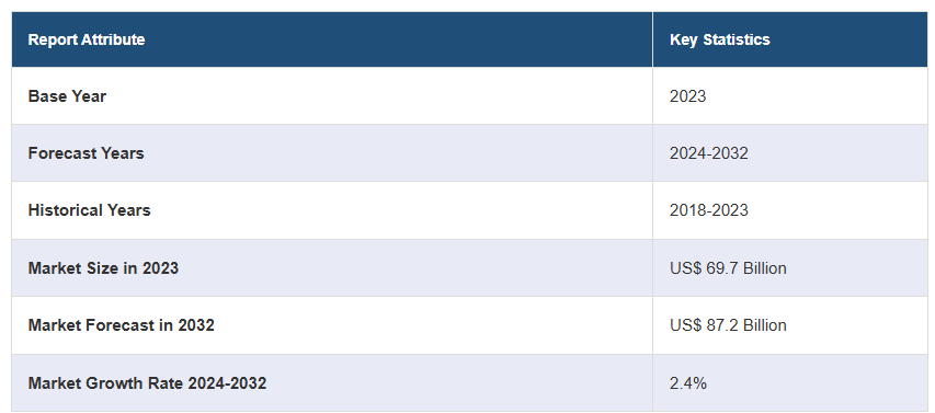 전 세계 통증 관리 약물 시장 규모는 2023년에 697억 달러에 달했습니다. IMARC 그룹은 2032년까지 시장 규모가 872억 달러에 달할 것으로 예상하고 있으며, 2024-2032년 동안 연평균 성장률(CAGR)이 2.4%에 달할 것으로 전망하고 있습니다. 이 시장은 만성 질환의 증가, 통증 관리 요법의 급속한 발전, 통증 관리에 대한 인식과 교육의 향상, 지원적인 정부 및 규제 프레임워크의 구현, 효과적인 수술 후 통증 관리에 대한 수요 증가에 힘입어 강력한 성장을 경험하고 있습니다.