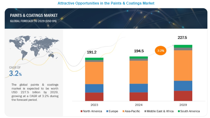 페인트 및 코팅 시장은 2024년 1,945억 달러 규모이며 2024년부터 2029년까지 연평균 3.2% 성장하여 2029년에는 2,275억 달러에 달할 것으로 예상됩니다. 전 세계 페인트 및 코팅 시장은 꾸준히 확대되고 있으며 이러한 발전 패턴은 계속될 것으로 예상됩니다. 주요 산업으로는 건축, 자동차 제조, 자동차 수리 및 건설이 수요의 주요 동인입니다. 페인트 및 코팅 시장은 중국과 인도가 주도하고 있습니다. 주요 시장은 아시아 태평양 지역이며 북미와 유럽이 그 뒤를 잇고 있습니다. 아시아 태평양 지역의 다양한 산업에 대한 견고한 경제 성과와 상당한 투자가 이러한 확장의 원인으로 꼽힙니다. 글로벌 경제 회복으로 인해 제조업 부문이 번창했으며, 도시화 증가로 인해 새로운 인프라와 건물에 대한 필요성이 증가했습니다.