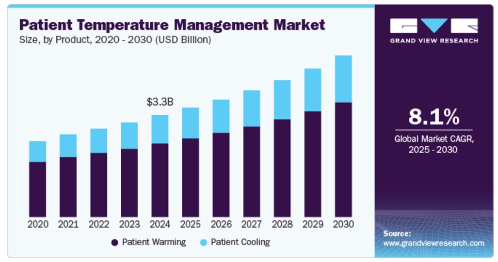 전 세계 환자 체온 관리 시장 규모는 2024년 33억 4,000만 달러로 추정되며 2025년부터 2030년까지 8.1%의 연평균 성장률을 보일 것으로 예상됩니다. 외과 수술의 증가는 시장 성장에 영향을 미치는 중요한 요인 중 하나입니다. 심혈관 질환과 암의 유병률이 증가함에 따라 온열 및 냉각 장치에 대한 수요가 증가하고 있습니다. 암의 경우 체온이 떨어지면 환자의 체내에서 암세포가 증식하게 됩니다. 이 문제를 해결하기 위해 방사선 요법 및 화학 요법과 함께 환자 온열 시스템이 사용됩니다.