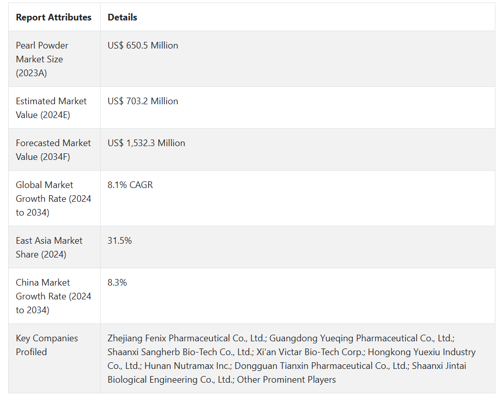 앞서 언급한 사실에 근거하여, 시장 조사 및 경쟁 정보 제공 업체인 Fact.MR에 따르면, 진주 분말 시장은 2024년부터 2034년까지 예측 기간 동안 연평균 8.1%의 성장률을 보일 것으로 예상됩니다.