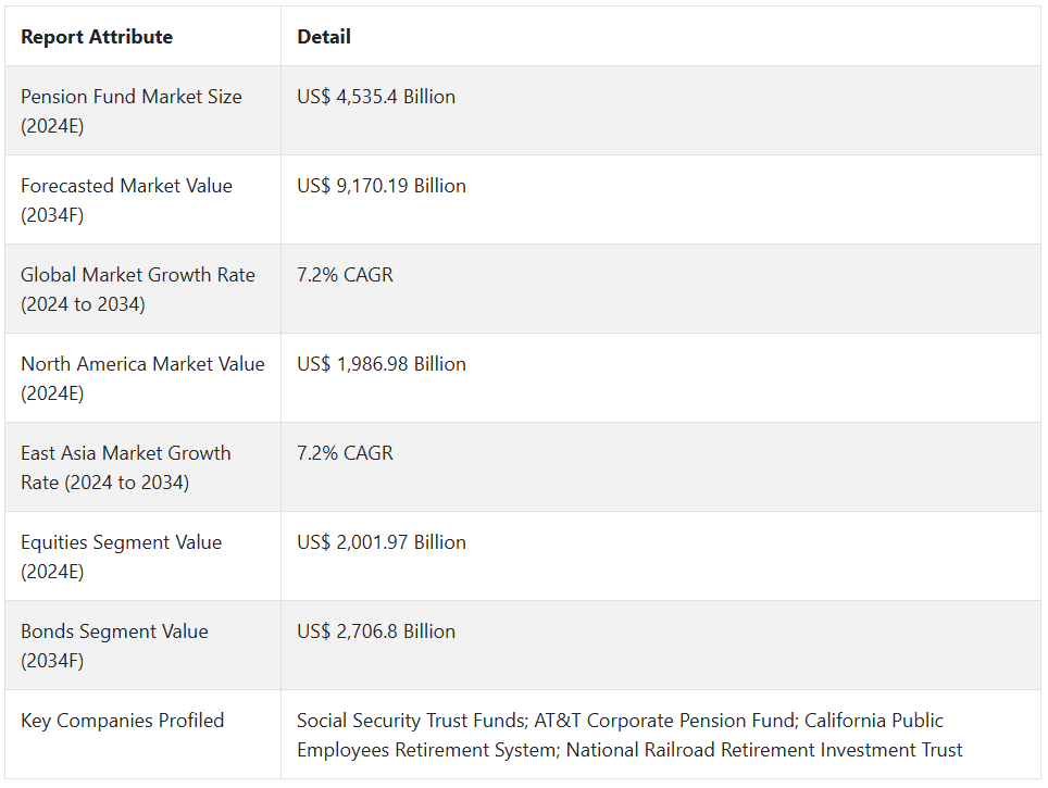 Fact.MR이 최근 발표한 보고서에 따르면, 2024년 전 세계 연금 기금 수요 수익은 4,535.4억 달러에 달할 것으로 추정되며, 2034년에는 연평균 7.2%의 성장률로 9,170.19억 달러에 이를 것으로 예상됩니다.
