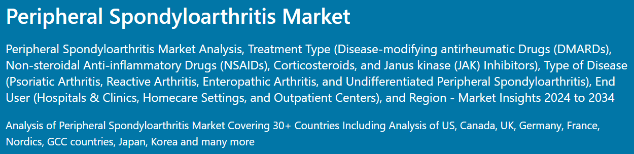 Fact.MR은 최근 발표된 보고서에서 지역별로 분류된 말초형 척추관절염의 주요 요인, 이 시장에서의 현재 연구, 최근의 주요 발전, 역학 분석, 매출 성장, 그리고 추측에 의한 기술적 확장 등에 대한 자세한 정보를 제공했습니다.