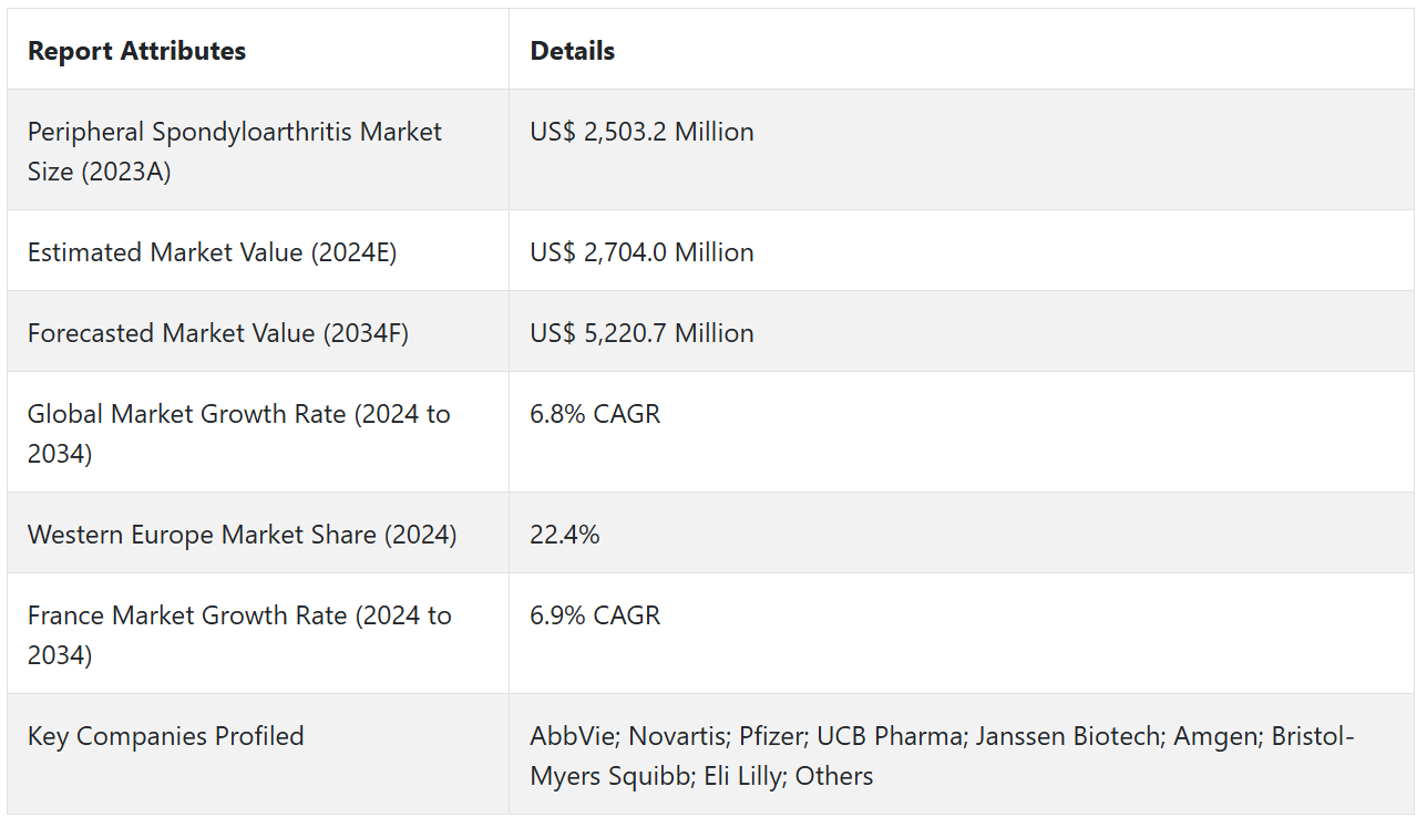 앞서 언급한 사실에 근거하여, 시장 조사 및 경쟁 정보 제공업체인 Fact.MR에 따르면, 말초형 척추관절염 시장은 2024년부터 2034년까지 예측 기간 동안 연평균 6.8%의 성장률을 보일 것으로 예상됩니다.