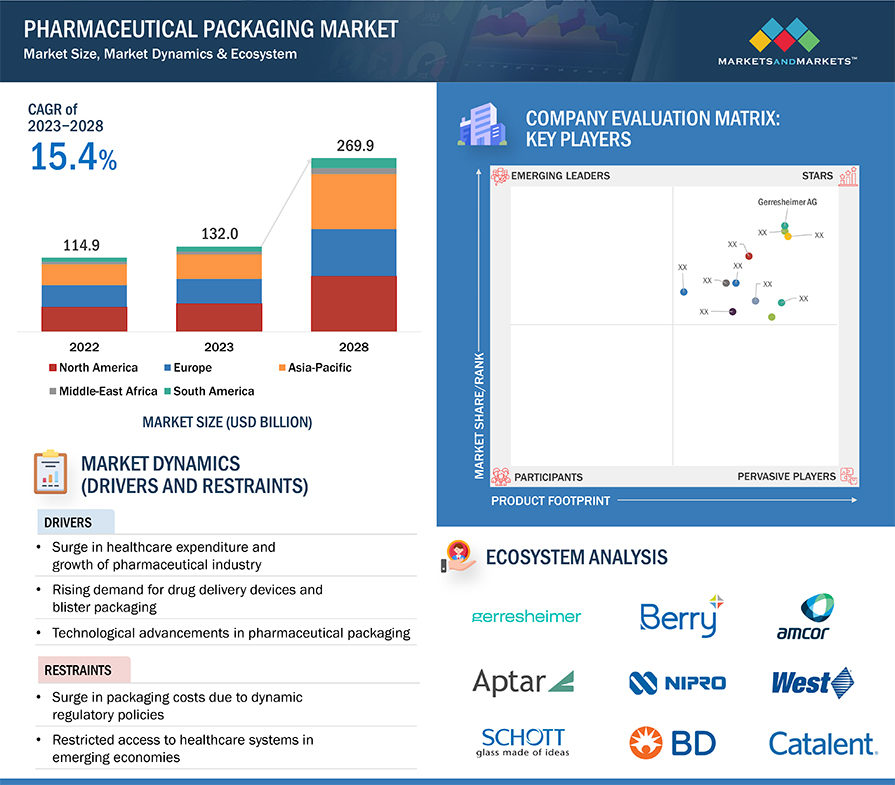 전 세계 제약 패키징 시장 규모는 2023년 1,320억 달러로 추정되며, 2028년에는 15.4%의 연평균 성장률로 2,699억 달러에 달할 것으로 예상됩니다. 만성 질환에 대한 우려가 증가하면서 제품 무결성을 보장하고 오염 위험을 최소화하는 패키징에 대한 수요가 증가함에 따라 시장 성장이 주도되고 있습니다. 약물 전달 장치 및 블리스터 포장에 대한 수요 증가도 제약 패키징 시장을 추진하는 데 중추적인 역할을 하고 있습니다.