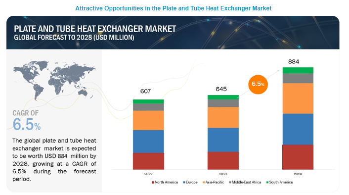 판형 및 튜브 열교환기 시장은 2023년 6억 4,500만 달러에서 연평균 6.5%의 성장률로 2028년까지 8억 8,400만 달러에 달할 것으로 예상됩니다. 판형 및 튜브형 열교환기는 산업 전반의 열 전달 메커니즘을 혁신하는 최첨단 솔루션입니다. 이러한 첨단 시스템은 다양한 열교환 기술 또는 재료를 단일 장치에 통합하여 다양한 산업 응용 분야에서 효율성과 적응성을 최적화합니다. 다양한 기능을 통해 특정 산업 수요에 맞는 맞춤형 솔루션을 제공하여 발전, 화학 처리, HVAC 등과 같은 중요한 부문에서 뛰어난 성능을 제공합니다. 효율성 향상과 환경 영향 감소에 중점을 둔 이 혁신적인 열교환기는 다양한 산업 운영에서 운영 효율성, 비용 효율성 및 지속 가능성을 높일 수 있는 길을 열어줍니다.