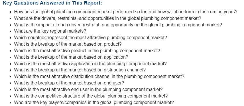 이 보고서는 또한 글로벌 배관 부품 시장의 경쟁 구도에 대한 포괄적인 분석을 제공합니다. 모든 주요 기업에 대한 자세한 프로필이 제공됩니다. 다루어진 회사들 중에는 Central States Industrial Equipment and Service Inc., Finolex Industries Limited, McWane Inc., Morris Group International Inc., Mueller Industries Inc., Nupi Industrie Italiane S.p.A., Reliance Worldwide Corporation Limited, Tigre USA Inc., Turnkey Industrial Pipe & Supply Inc., Uponor Oyj, Westlake Pipe & Fittings Corporation (Westlake Corporation) 등이 있습니다. 이 목록은 일부 기업에 대한 목록일 뿐이며, 전체 목록은 보고서에서 확인할 수 있습니다.