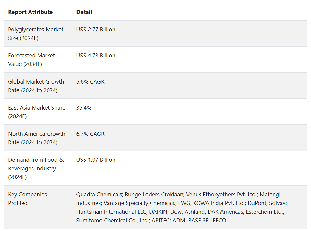 Fact.MR의 보고서에 따르면, 2024년 전 세계 폴리글리세레이트 시장의 가치는 미화 27억 7천만 달러에 달할 것으로 추정됩니다. 또한, 이 시장은 연평균 5.6%의 성장률을 보이며 2034년 말에는 미화 47억 8천만 달러에 이를 것으로 평가됩니다.