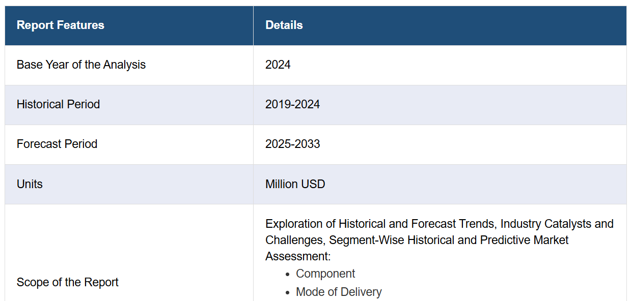 IMARC Group은 2025-2033년 국가별 예측과 함께 시장 각 세그먼트의 주요 동향에 대한 분석을 제공합니다. 본 보고서는 구성 요소, 제공 방식, 최종 사용자 기준으로 시장을 분류하였습니다.