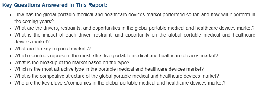 글로벌 휴대용 의료 및 헬스케어 기기 시장은 웨어러블 기기, 스마트워치, 피트니스 트래커, 휴대용 진단 기기, 원격 환자 모니터링 솔루션 등의 발전과 함께 소비자 및 의료 서비스 제공자의 변화하는 요구를 충족시키는 혁신으로 인해 상당한 성장을 경험하고 있습니다. 이와 함께 휴대용 의료 기기의 기능과 역량을 강화하기 위해 인공 지능, 사물 인터넷(IoT), 클라우드 컴퓨팅, 데이터 분석 등의 첨단 기술을 기기에 통합하는 것이 시장을 크게 뒷받침하고 있습니다. 원격 의료와 원격 환자 모니터링의 채택이 증가함에 따라, 기업들은 환자와 의료 서비스 제공자 간의 원활한 데이터 전송을 가능하게 하는 기술에 투자하고 있습니다. 이러한 장치들은 생체 신호와 건강 변수의 지속적인 모니터링을 가능하게 함으로써, 의료 전문가들이 환자의 상태를 원격으로 추적하고 적시에 개입을 할 수 있도록 합니다. 또한, 사용하기 쉽고 착용하기 편하며 미적으로도 매력적인 장치의 도입이 시장에 기여하고 있습니다.