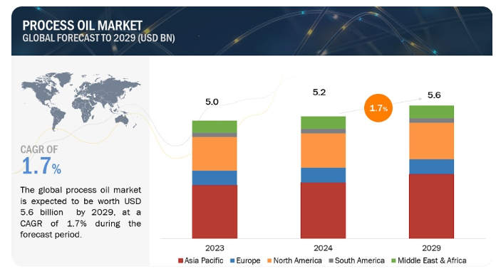 글로벌 프로세스 오일 시장은 2024년 52억 달러 규모이며 2024년부터 2029년까지 연평균 1.7% 성장하여 2029년에는 56억 달러에 달할 것으로 예상됩니다. 농업에서의 프로세스 오일 사용이 프로세스 오일 시장의 성장을 주도하고 있습니다. 프로세스 오일 시장의 성장은 주로 타이어 및 고무 응용 분야에서 프로세스 오일에 대한 수요 증가에 의해 주도되고 있습니다. 이러한 수요 급증은 자동차 산업의 확대와 고무 기반 제품의 생산 증가로 인해 촉진되고 있습니다. 또한 제조 및 섬유와 같은 다른 부문도 이러한 시장 확대에 기여하여 다양한 산업에서 공정 오일의 다용도 적용을 강조하고 있습니다.