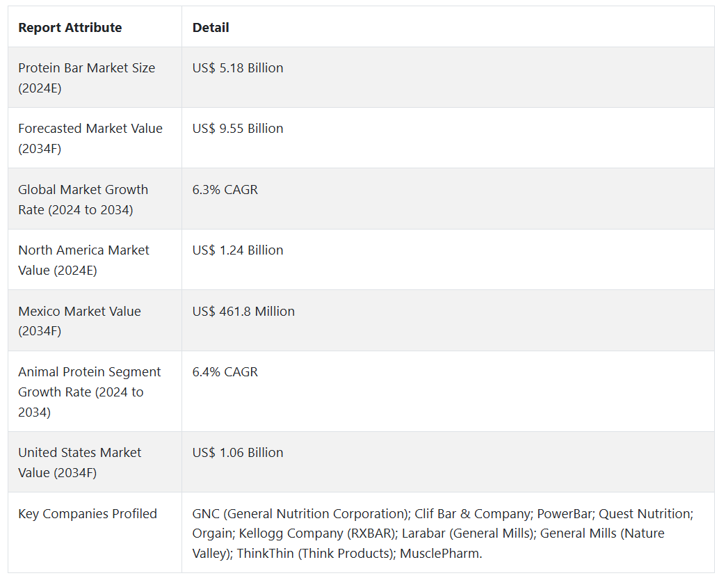 단백질 바의 세계 시장은 2024년부터 2034년까지 연평균 6.3%의 성장률을 보일 것으로 예상됩니다.
