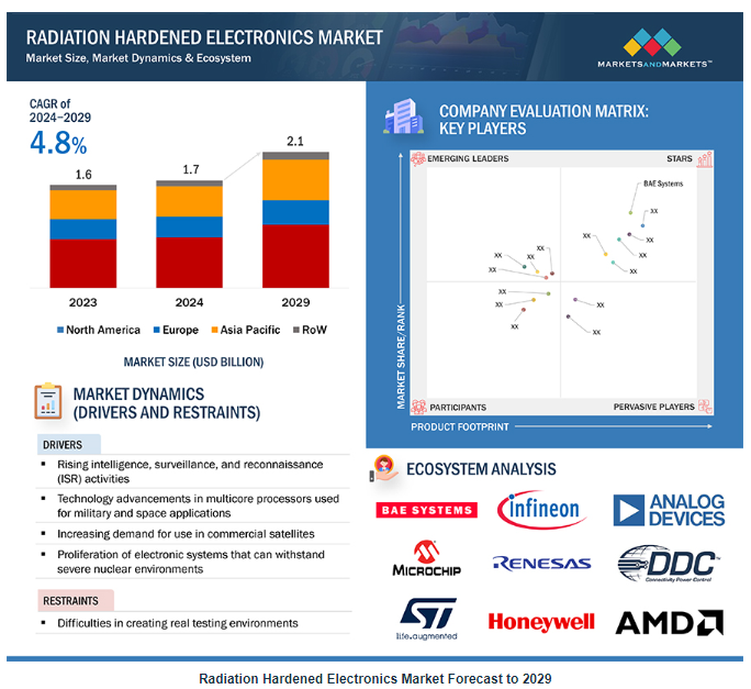 방사선 강화 전자제품 시장은 2024년 17억 달러에서 2029년 21억 달러로 2024년부터 2029년까지 4.8%의 연평균 성장률(CAGR)로 성장할 것으로 예상됩니다. 방사선 강화 전자기기 시장은 전자기기에 사용되는 소재, 전자기기 설계 및 테스트 방법론에 대한 지속적인 연구 개발로 인해 성장하고 있습니다. 반도체 회사들의 이러한 지속적인 노력으로 방사선 강화 전자 기기의 성능, 신뢰성, 경제성이 향상되고 있습니다.