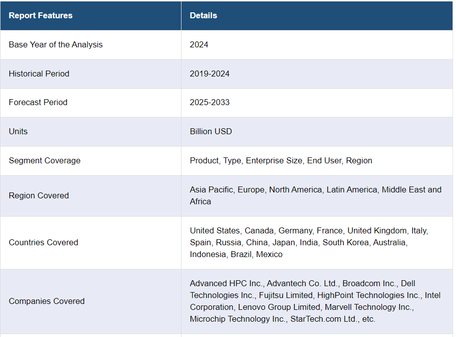 IMARC Group은 2025-2033년 글로벌, 지역 및 국가 수준에서의 예측과 함께 글로벌 RAID 컨트롤러 카드 시장의 각 부문의 주요 동향에 대한 분석을 제공합니다. 이 보고서는 제품, 유형, 기업 규모 및 최종 사용자를 기준으로 시장을 분류했습니다.