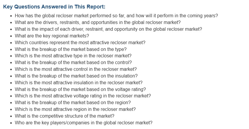 마지막으로, 경쟁 구도 섹션에서는 시장 구조, 주요 업체별 시장 점유율, 시장 참여자 포지셔닝 및 성공 전략을 포함한 경쟁 관련 정보를 제공합니다. 주요 업체의 프로필도 제공되어 시장 참여자들의 특성을 이해하는 데 도움을 줍니다. 이 문서는 리클로저 시장에 대한 종합적이고 체계적인 정보를 제공하여 이해관계자들이 시장의 기회를 파악하고 전략을 수립하는 데 유용한 자료로 활용될 수 있습니다.