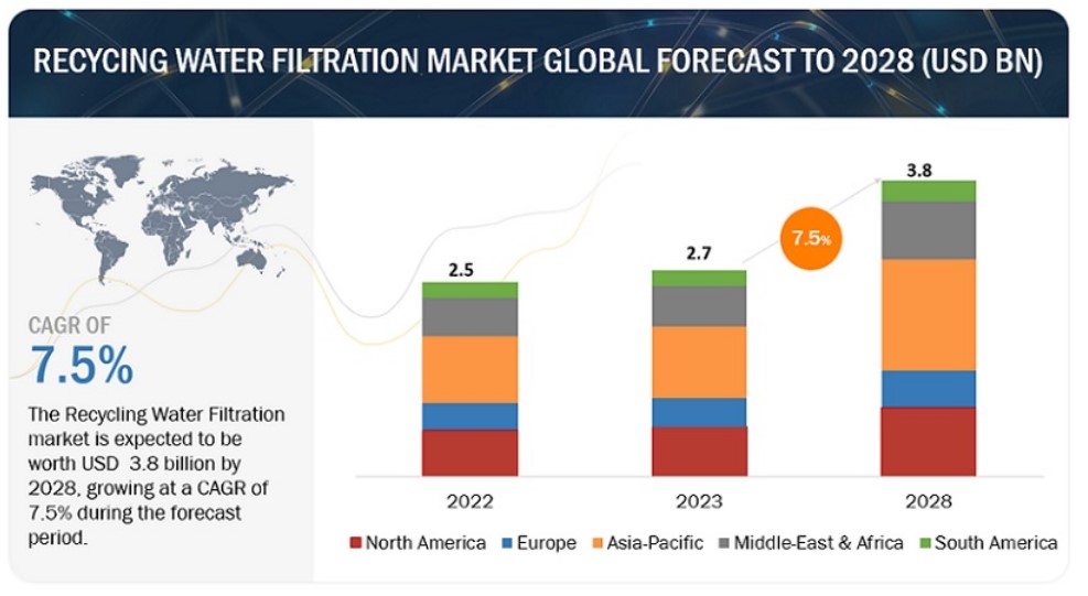 재활용 물 여과 시장은 2023년 약 27억 달러에서 2028년까지 38억 달러로 예측 기간 동안 7.5%의 연평균 성장률(CAGR)로 성장할 것으로 예상됩니다. 재활용 정수 필터링 시장은 다양한 산업 분야에서 재활용 정수 필터링이 수질과 순도를 보장하는 중추적인 역할을 수행하면서 확대되고 있습니다. 석유 및 가스 산업에서 효율적인 정수 여과는 장비와 공정을 보호하고 운영 안정성을 향상시키는 데 필수적입니다. 발전 시설에서는 냉각수의 무결성을 유지하기 위해 첨단 여과 시스템을 사용하여 장비의 전반적인 효율성과 수명을 개선합니다. 식음료 산업에서는 엄격한 품질 기준을 충족하기 위해 엄격한 여과 공정을 사용하여 소모품의 안전과 순도를 보장합니다. 담수화 시설은 첨단 여과 기술을 활용하여 바닷물에서 담수를 생산함으로써 전 세계적인 물 부족 문제를 해결합니다. 또한, 농장에서는 관개 효율성을 높이기 위해 농업용 정수 시스템을 사용하여 지속 가능하고 책임감 있는 물 사용을 장려합니다. 이러한 모든 분야에서 정수 여과는 운영 효율성, 제품 품질 및 환경 지속 가능성에 기여하는 중요한 요소로 부상하고 있습니다.