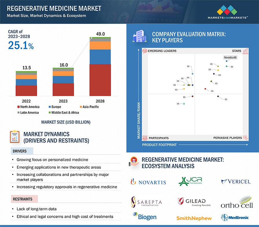 전 세계 재생 의학 시장 규모는 2023년 160억 달러에서 2028년 490억 달러로 연평균 25.1% 성장할 것으로 예상됩니다. 이러한 성장은 개인 맞춤형 의료에 대한 관심, 파트너십 증가, 치료 영역 확대, 규제 승인 증가에 따른 것입니다. 그러나 윤리적 우려와 높은 비용이 과제로 남아 있습니다. 이 시장은 3D 프린팅과 같은 기술 발전의 혜택을 누리고 있지만 미흡한 환급 정책으로 인해 장애물에 직면해 있습니다. 특히 근골격계 질환에 대한 세포 치료가 2022년 시장을 장악했으며, 아시아 태평양 지역이 가장 높은 성장률을 보일 것으로 예상됩니다. 주요 기업으로는 노바티스, 바이오젠, 사렙타, 길리어드, 암젠 등이 있습니다. 최근의 발전에는 혁신적인 치료법에 대한 FDA 승인과 유전자 치료 및 단백질 기반 치료법에 대한 중요한 협력이 포함됩니다.