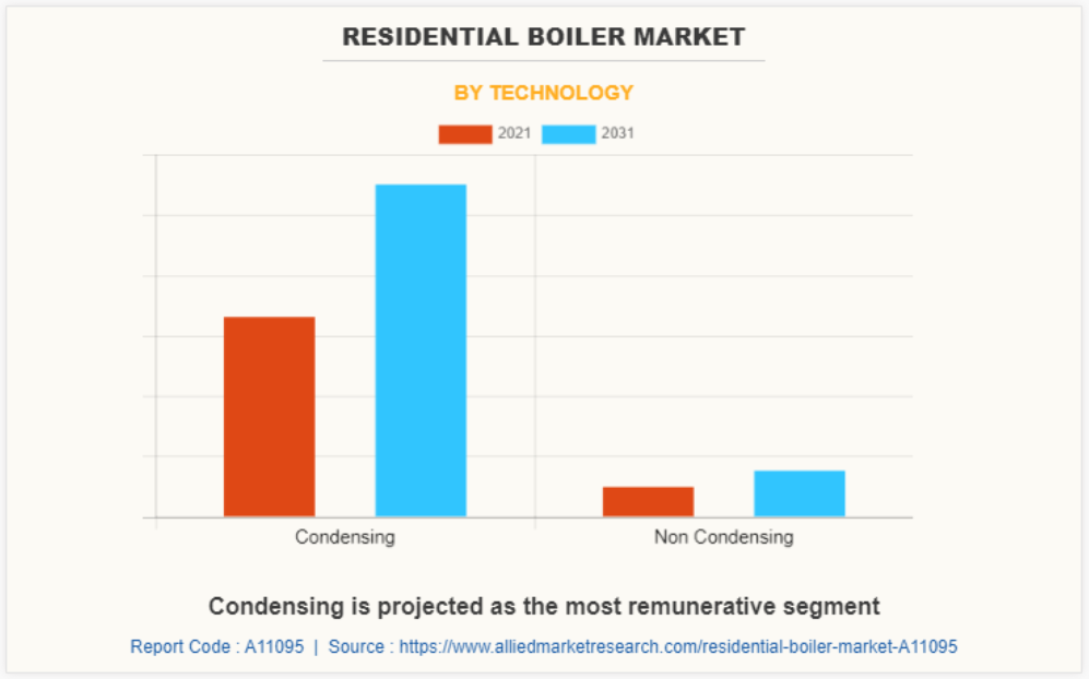 기술에 기반한 응축은 예측 기간 동안 가장 큰 시장이 될 것입니다. 공간 난방 및 물 난방 응용 분야에서 보일러에 대한 수요가 증가함에 따라 분석 기간 동안 가정용 보일러 시장의 성장이 촉진될 것으로 예상됩니다.