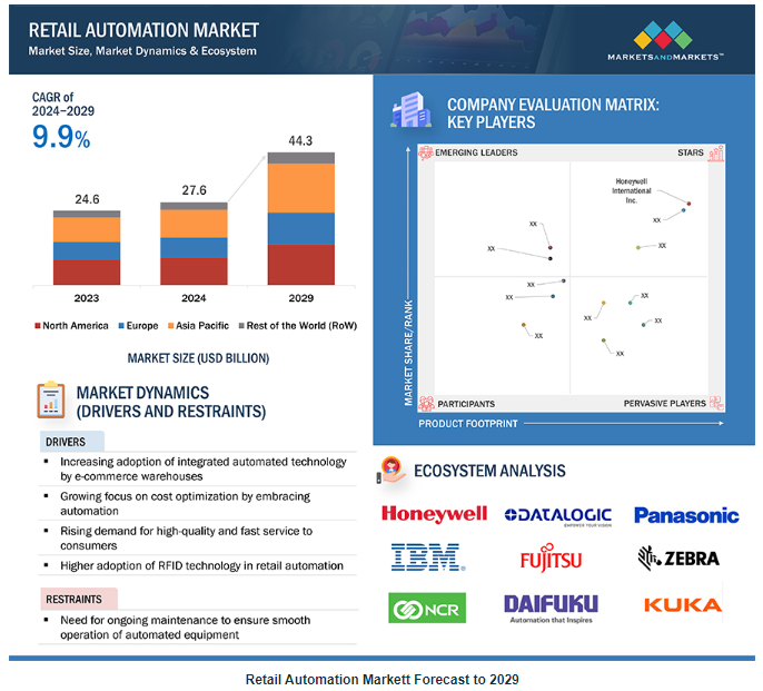 글로벌 리테일 자동화 시장은 2024년 276억 달러 규모로 2029년에는 443억 달러에 달할 것으로 예상되며, 2024년부터 2029년까지 9.9%의 연평균 성장률을 보일 것으로 전망됩니다. 이 시장은 전자상거래 물류창고의 통합 자동화 기술 도입 증가에 힘입어 성장하고 있습니다. 그러나 자동화 기술 도입에 따른 사이버 보안 위협 증가와 같은 과제가 시장 성장을 저해하고 있습니다. 이러한 장애물에도 불구하고 자동화 기술을 활용하여 고객에게 향상된 리테일 경험을 제공할 수 있는 기회가 있습니다.