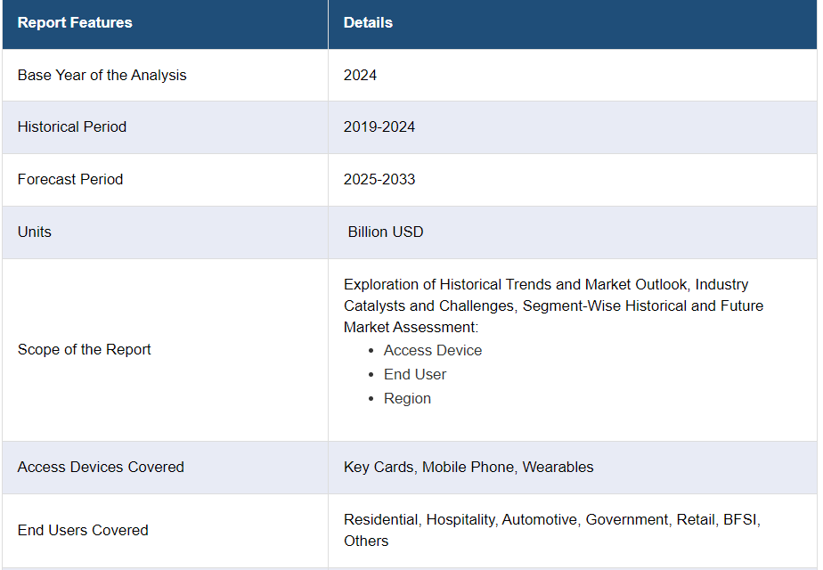 IMARC Group은 2025-2033 년 글로벌, 지역 및 국가 수준의 예측과 함께 글로벌 RFID 잠금 장치 시장 보고서의 각 부문의 주요 동향에 대한 분석을 제공합니다. 이 보고서는 액세스 장치와 최종 사용자를 기준으로 시장을 분류했습니다.