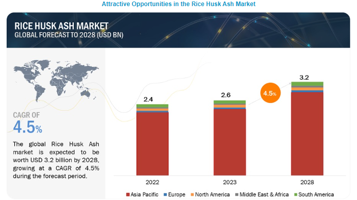 글로벌 왕겨재 시장은 2023년 26억 달러에서 2028년 32억 달러로 예측 기간 동안 4.5%의 연평균 성장률(CAGR)로 성장할 것으로 예상됩니다. 건축 및 건설에 왕겨 재를 사용하는 것이 왕겨 재 시장의 성장을 주도하고 있습니다. 왕겨 재의 사용은 건설, 농업 및 제조와 같은 산업에서 다양한 용도로 사용되기 때문에 매우 중요합니다. 콘크리트 강도와 토양 비옥도를 향상시키고 다양한 제품의 원료로 사용되어 지속 가능한 관행과 자원 최적화에 기여하는 귀중한 자원입니다.