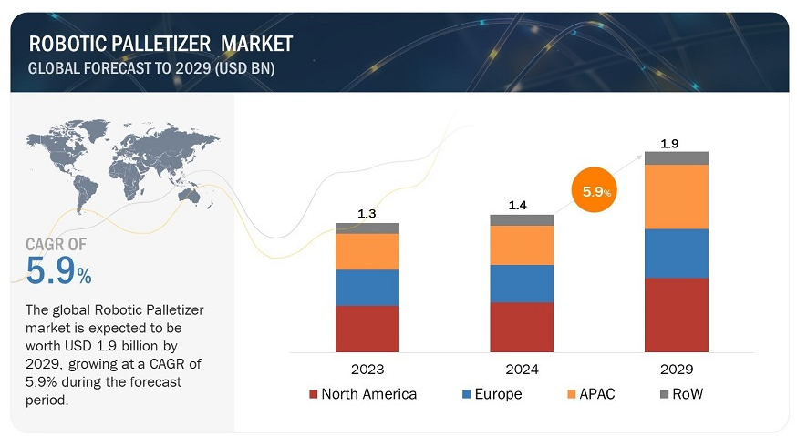 로봇 팔레타이저 시장은 2024년 14억 달러에서 2029년 19억 달러로 성장할 것으로 예상되며, 2024년부터 2029년까지 5.9%의 연평균 성장률(CAGR)로 성장할 것으로 전망됩니다. 다관절 팔레타이징 로봇의 광범위한 채택이 시장을 주도할 것으로 예상되며, 다양한 산업에서 다관절 로봇의 채택률이 높은 것은 이러한 로봇 시스템의 다목적성과 효율성을 반영하는 여러 요인에 기인할 수 있습니다. 여러 관절과 높은 자유도를 특징으로 하는 다관절 로봇은 복잡한 환경을 탐색하고 다양한 작업을 수행할 수 있어 제조, 자동차, 전자, 의료 등 다양한 산업에 적합하기 때문에 다양한 애플리케이션에서 점점 더 인기를 얻고 있습니다.