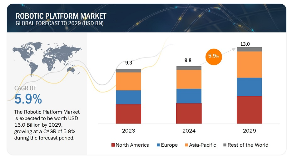 로봇 플랫폼 시장은 2024 년 98 억 달러로 평가되었으며 2029 년에는 130 억 달러에이를 것으로 예상되며 예측 기간 동안 5.9 %의 CAGR을 기록 할 것으로 예상됩니다. 로봇 플랫폼 시장의 성장은 로봇 연구 개발에 대한 정부 투자 증가, 인건비 및 에너지 비용 최소화를 위한 중소기업의 로봇 소프트웨어 채택 가속화, 클라우드 기반 로봇 소프트웨어 솔루션 채택 증가, 의료 애플리케이션에서의 서비스 로봇 채택, 창고 및 물류 부문에서의 자율 이동 로봇(AMR) 채택에 의해 주도되고 있습니다.