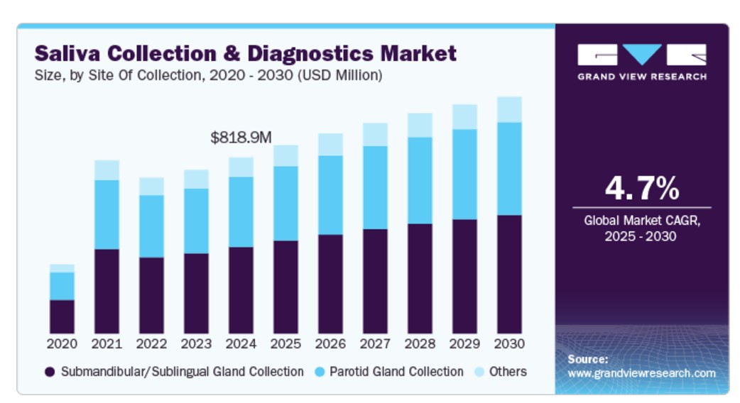 전 세계 타액 채취 및 진단 시장 규모는 2024년 8억 1,890만 달러로 추정되며 2025년부터 2030년까지 4.7%의 연평균 성장률을 보일 것으로 예상됩니다. 만성 질환의 빠른 진단에 대한 수요 증가, 유아 샘플 채취 기술의 발전, 다양한 질환에 대한 안전하고 편리한 진단 옵션에 대한 대중의 인식 상승 등이 주요 성장 요인으로 작용하고 있습니다. 예를 들어, 2021년 9월에 써모 피셔 사이언티픽은 연구 분야에서 안전하게 샘플을 수집할 수 있도록 설계된 SpeciMAX 안정화 타액 수집 키트를 출시했습니다. 이 키트에는 유출 방지 깔때기, 표준화된 튜브, 안전한 캡이 포함되어 있어 적절한 샘플 취급이 용이합니다.