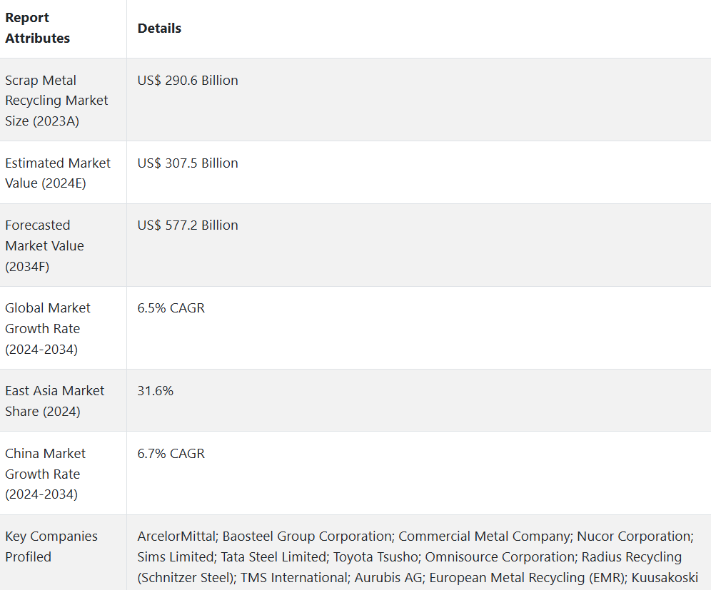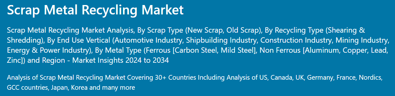 Fact.MR이 최근 발표한 보고서는 판매 성장, 생산 능력, 잠재적 기술 발전에 대한 데이터와 함께 여러 지역의 주요 고철 재활용 업체의 가격대에 대한 자세한 통찰력을 제공합니다.