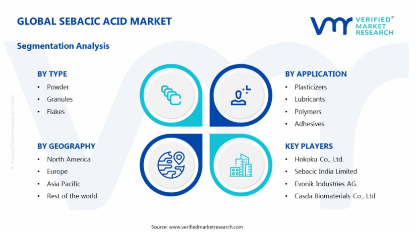 시장 경쟁과 대체: 세바스산 시장은 플라스틱, 섬유, 자동차 산업에서 사용할 수 있는 많은 화학 대체품과 경쟁하고 있습니다. 합성산이나 바이오 기반산과 같은 세바스산의 대체품은 비용 절감이나 더 높은 성능 품질을 제공할 수 있기 때문에 세바스산 수요에 압박을 가합니다. 시장 점유율을 유지하기 위해 제조업체들은 제품을 계속 개발하고 개선해야 합니다.
