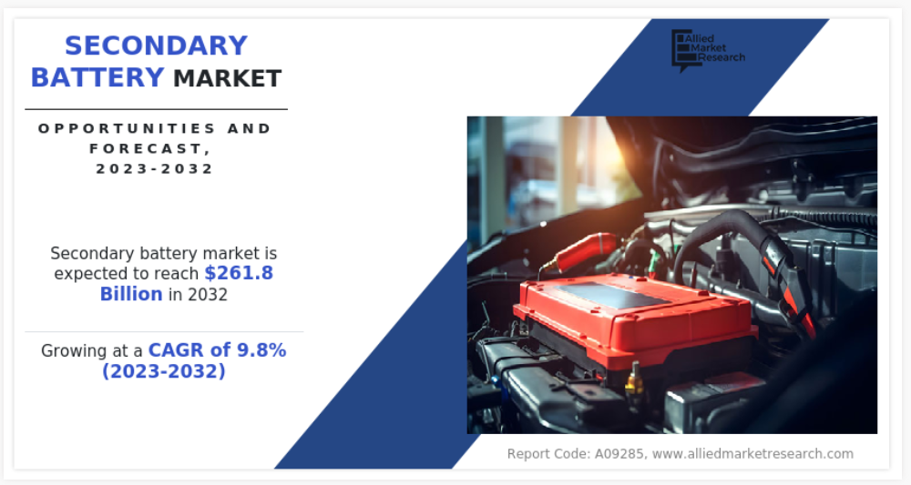 2022년 전 세계 2차 전지 시장 규모는 967억 달러였으며, 2032년에는 2,618억 달러에 이를 것으로 예상되며, 2023년부터 2032년까지 연평균 성장률(CAGR) 9.8%로 성장할 것으로 전망됩니다.
