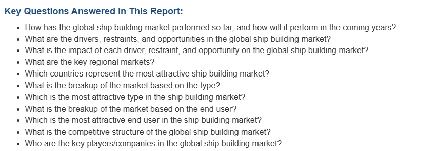 이 보고서는 또한 세계 선박 건조 시장의 경쟁 구도에 대한 포괄적인 분석을 제공합니다. 시장 구조, 주요 업체의 시장 점유율, 업체 포지셔닝, 최고의 성공 전략, 경쟁 대시보드, 기업 평가 사분면 등과 같은 경쟁 분석이 이 보고서에 포함되어 있습니다. 또한, 모든 주요 기업의 상세한 프로필이 제공되었습니다. 일부 기업으로는 China Shipbuilding Trading Co. Ltd., Damen Shipyards Group, Fincantieri S.p.A., Huntington Ingalls Industries Inc., JSC United Shipbuilding Corporation, Korea Shipbuilding & Offshore Engineering Co. Ltd., Larsen & Toubro Ltd., Mitsubishi Shipbuilding Co. Ltd., Oshima Shipbuilding Co. Ltd., Samsung Heavy Industries Co. Ltd., Tsuneishi Shipbuilding Co. Ltd., Yangzijiang Shipbuilding (Holdings) Ltd. 등. 이 목록은 일부 기업만 포함하고 있으며, 전체 목록은 보고서에서 확인할 수 있습니다.
