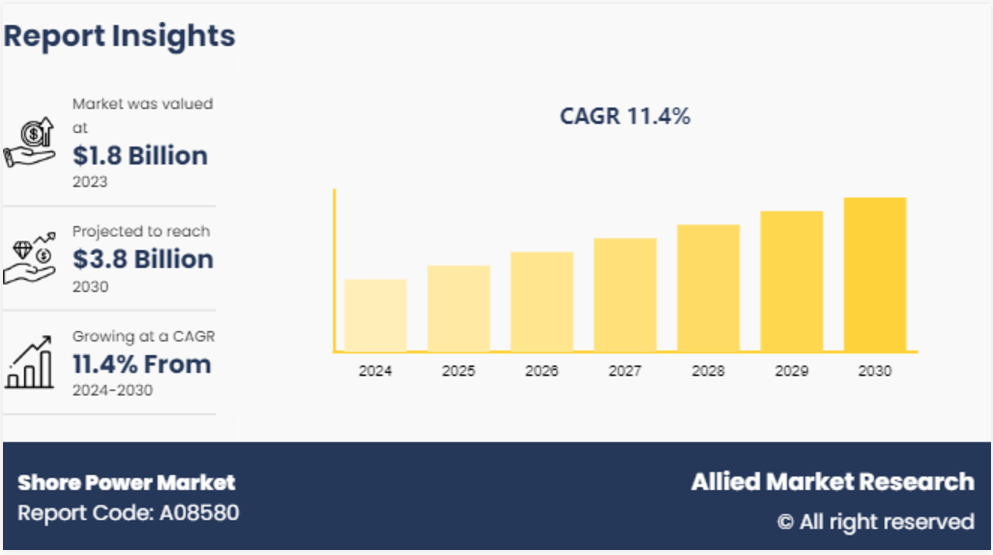 전 세계 해안 전력 시장은 2023년 18억 달러에서 시작해 2030년까지 연평균 11.4% 성장하여 38억 달러에 이를 것으로 예상됩니다. 해안 전력은 선박이 항구에 정박할 때 육상 전기 공급 장치와 연결하여 발전기를 차단하고 오염물질과 온실가스 배출을 줄이는 환경적 조치로, 특히 항구 도시에서 중요한 역할을 합니다.