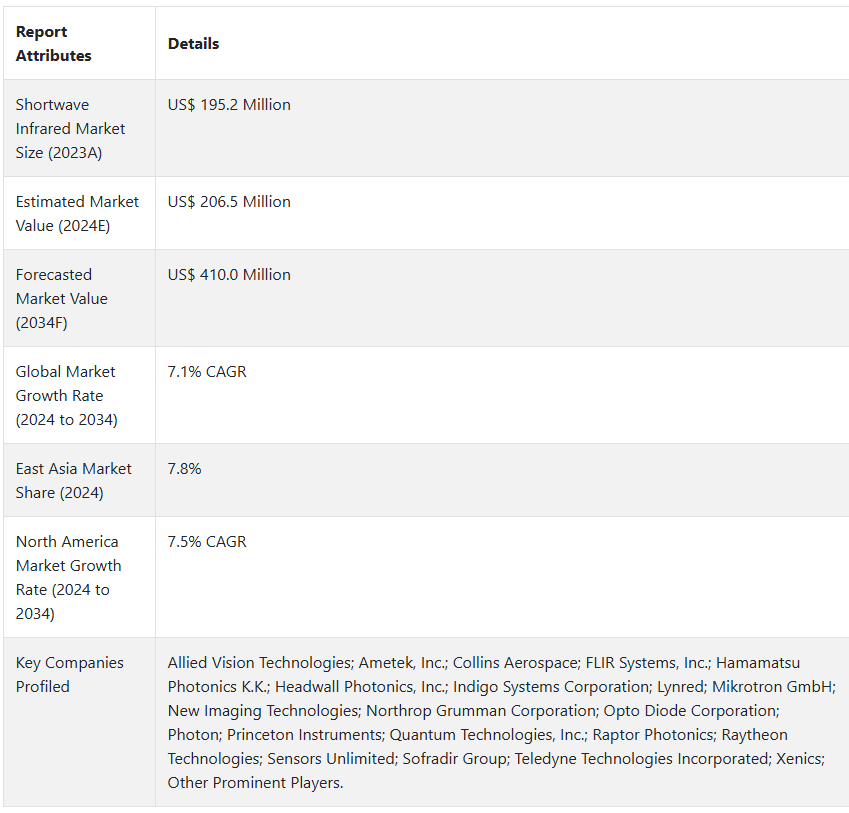 전 세계 단파 적외선 시장 규모는 2034년 말까지 미화 4억 100만 달러에 이를 것으로 예상됩니다.