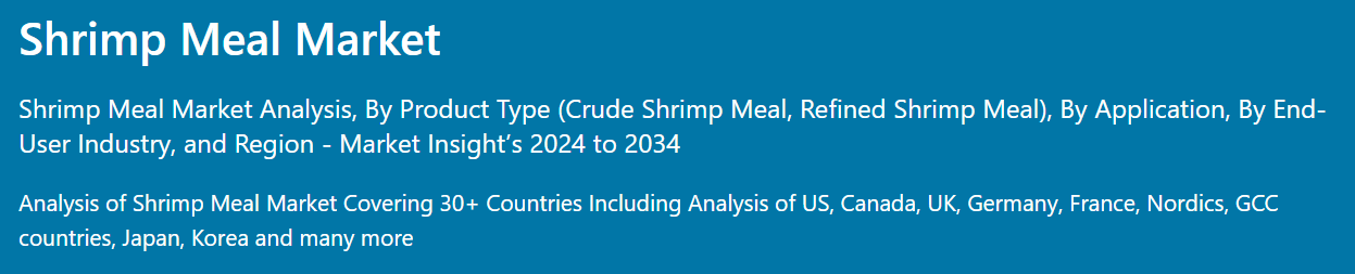 앞서 언급한 사실에 근거하여, 시장 조사 및 경쟁 정보 제공 업체인 Fact.MR에 따르면, 새우 사료 시장이 2024년부터 2034년까지 예측 기간 동안 연평균 7.1%의 성장률을 보일 것으로 예상됩니다.