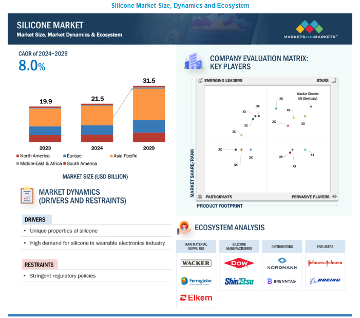 실리콘 시장은 Wacker Chemie AG(독일), Shin-Etsu Chemical Co. (일본), 모멘티브 퍼포먼스 머티리얼즈(미국), 엘켐 ASA(노르웨이), 다우(미국) 등이 있습니다. 확장, 협업 및 거래는 실리콘 시장에서의 입지를 강화하기 위해 이러한 주요 업체들이 채택한 주요 전략 중 일부였습니다. 새로운 프로젝트와 계약에 중점을 두었습니다.