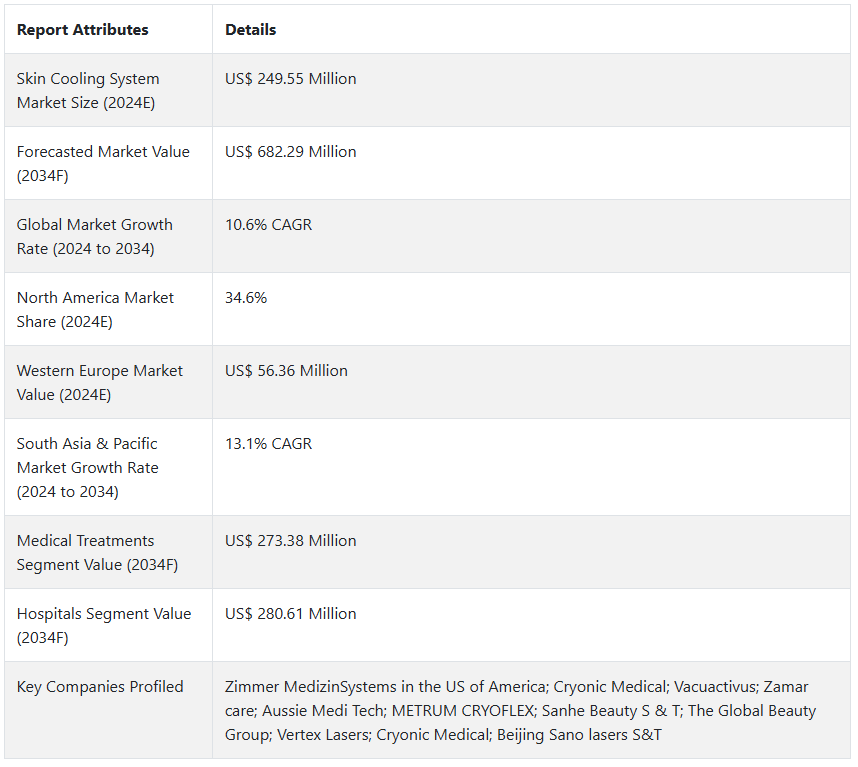 피부 냉각 시스템에 대한 수요는 2034년 말까지 미화 6억 8,229만 달러에 이를 것으로 예상됩니다.