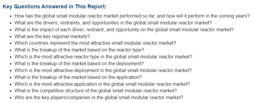 글로벌 시장은 주로 향상된 안전 기능과 수동 안전 시스템에 의해 주도되고 있습니다. 이와 더불어, 온실가스 배출을 최소화하여 환경에 미치는 영향을 줄임으로써 시장에 긍정적인 전망을 만들어내고 있습니다. 또한, 다양한 응용 프로그램의 다양성과 확장성이 시장에 크게 기여하고 있습니다. 이 외에도, 기존의 원자력 발전소에 비해 초기 자본 비용이 낮다는 점도 시장에 많은 기회를 제공합니다. 게다가, 규모의 경제를 가능하게 하는 표준화의 잠재력이 커지고 있다는 점도 시장의 촉매 역할을 하고 있습니다. 게다가, 인프라가 제한적인 외딴 지역의 에너지 접근성이 개선되면서 제품 수요가 증가하고 있습니다. 또한, 지속 가능하고 깨끗한 에너지 원에 대한 관심이 높아지면서 시장이 활성화되고 있습니다.
