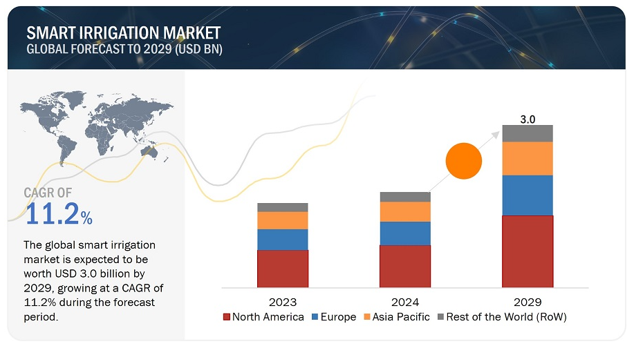 스마트 관개 시장은 2024년에 18억 달러의 가치가 있을 것으로 추정되며, 예측 기간 동안 11.2%의 연평균 성장률로 2029년에는 30억 달러에 달할 것으로 예상됩니다. 수자원 보존을 위한 정부 이니셔티브의 채택이 급증하는 것이 시장의 주요 동인 중 하나입니다. 또한 컨트롤러와 센서의 비용 감소는 스마트 관개 시장에서 성장 기회를 제공합니다.