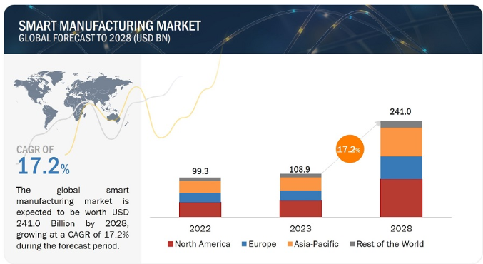 전 세계 스마트 제조 시장 규모는 2023년 1,089억 달러에서 2028년 2,410억 달러로 성장하여 17.2%의 연평균 성장률을 기록할 것으로 예상됩니다.